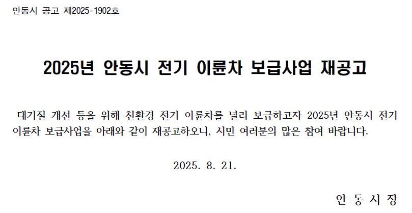 2025년 경북 안동시 전기오토바이 보조금 핵심 정보! (이륜차 보급사업 공고문 요약) 본문